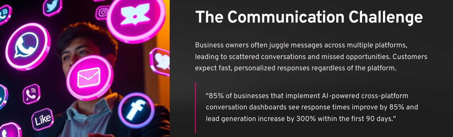 But here's what most business owners don't realize: 85% of businesses that implement AI-powered cross-platform conversation dashboards see response times improve by 85% and lead generation increase by 300% within the first 90 days.