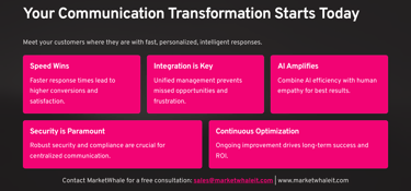 If you're serious about implementing an AI-powered cross-platform conversation dashboard for your business, MarketWhale's team of experts is here to help. We've successfully implemented these systems for over 500 businesses across North America, the UK, and Australia.