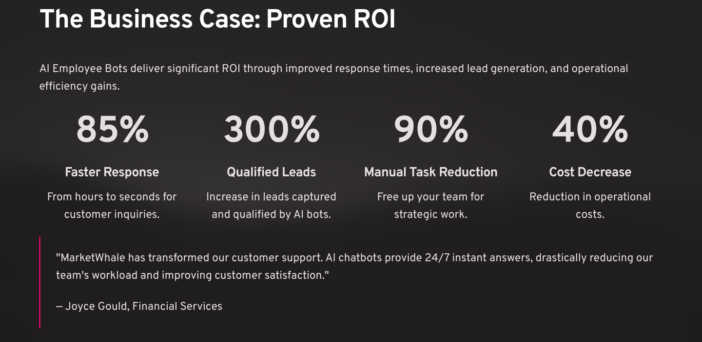 Joyce Gould, Financial Services: "MarketWhale has transformed our customer support. AI chatbots provide 24/7 instant answers, drastically reducing our team's workload and improving customer satisfaction. It's like having an extra team working around the clock!"