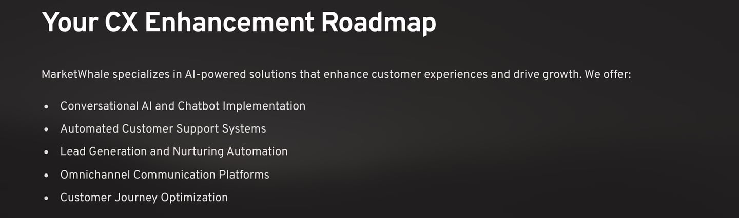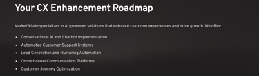 Whether you're a small business looking to implement your first AI chatbot or an enterprise seeking comprehensive customer experience transformation, MarketWhale provides the expertise, technology, and support you need to achieve remarkable results.