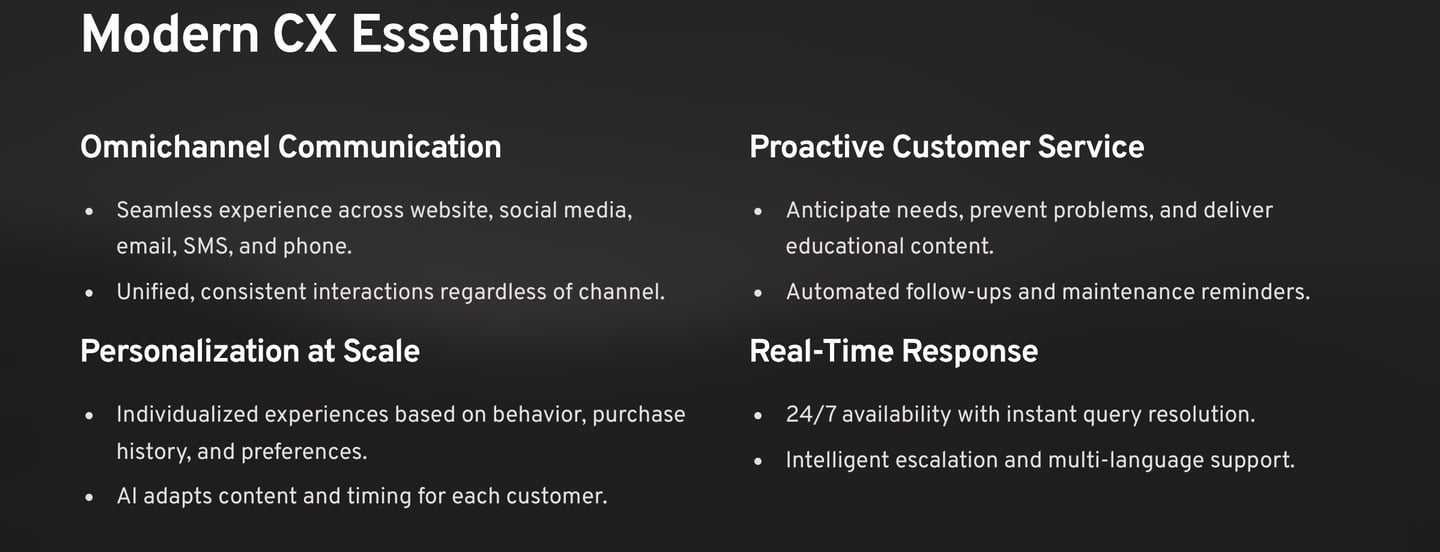 Personalization Engines: AI creates unique, personalized experiences for each customer based on their history, preferences, and behavior patterns, making every interaction feel tailored and relevant.