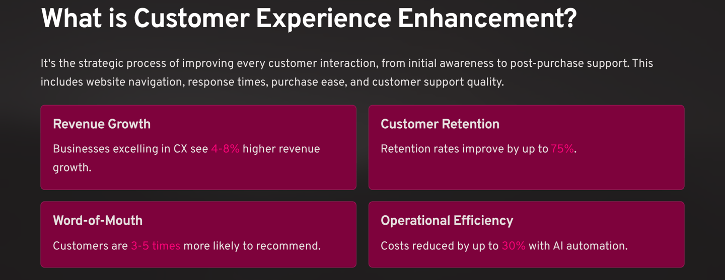 Operational Efficiency: Modern customer experience enhancement, particularly when powered by AI, doesn't just improve customer satisfaction—it also streamlines your operations. Automated responses, intelligent routing of inquiries, and predictive customer service can reduce operational costs by up to 30% while improving service quality.