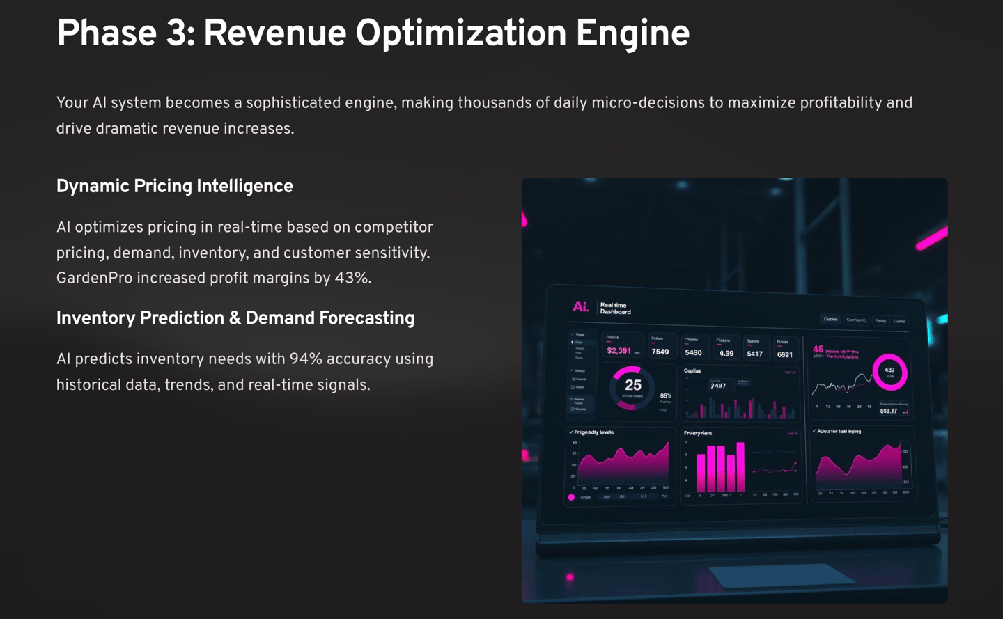 Revenue Optimization Suite AI-powered pricing, inventory management, and conversion optimization tools that maximize profitability.