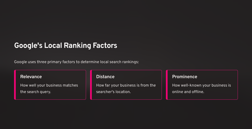 Google uses three primary factors to determine local search rankings, known as the "Local Pack Ranking Factors":