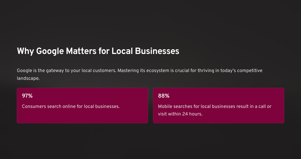 The digital landscape for local businesses has never been more competitive—or more full of opportunity. Every day that your business doesn't have a strong Google presence is a day you're handing potential customers to your competitors.