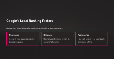 1. Relevance How well your business matches what someone is searching for. This includes your business category, descriptions, and the content on your website.