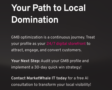 About MarketWhale IT: We specialize in AI-powered business automation and local marketing solutions that help business owners achieve measurable growth. Our comprehensive systems integrate GMB optimization with advanced automation technologies to maximize your local market presence while minimizing manual management time. Contact us today to discover how our proven strategies can transform your local business visibility and drive sustainable revenue growth.