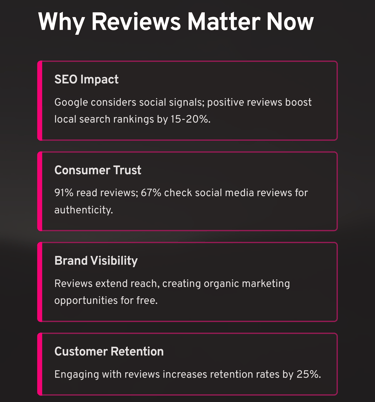Competitive Advantage In competitive markets, social media reviews often serve as the deciding factor between similar businesses. Companies with superior review management strategies capture a disproportionate share of market attention and customer preference.